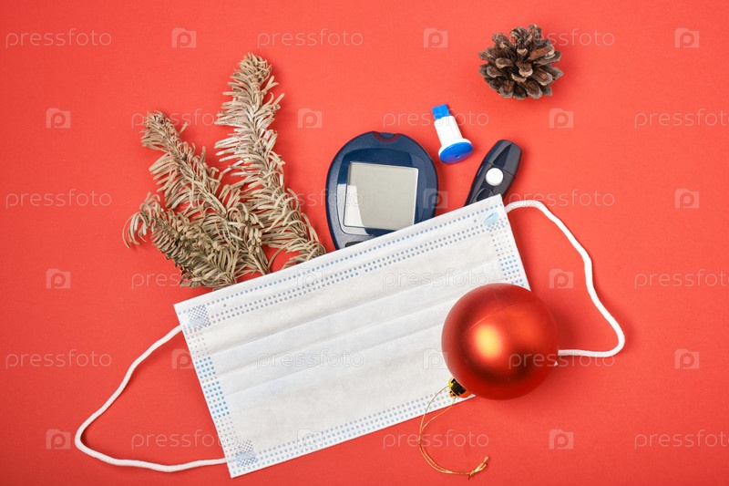 Маска для лица, глюкометр, ланцет, еловая ветка и рождественский декор на красном фоне