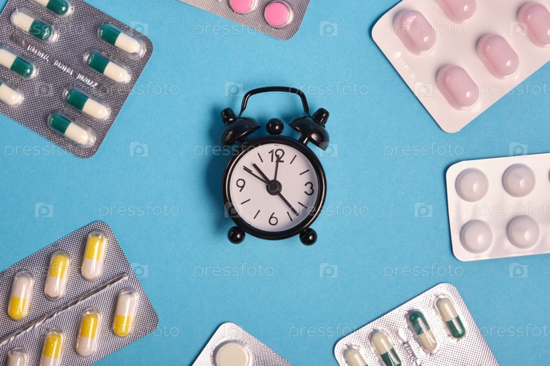 Упаковка таблеток и пилюль на столе с часами посередине. Лекарственное средство