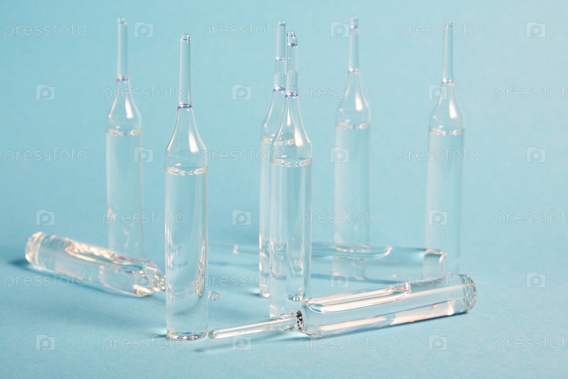 Стеклянные ампулы крупным планом. Медицинские ампулы. Медицинские ампулы на синем фоне