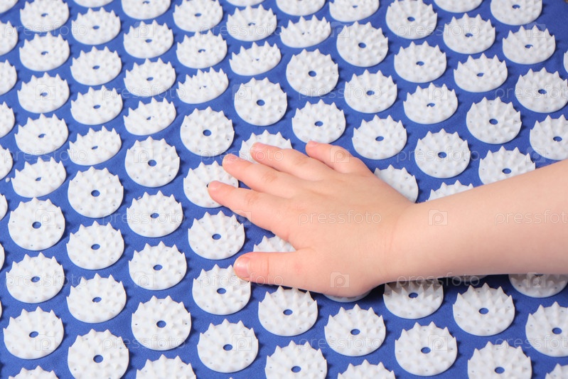 Детская ладонь на синем массажном коврике для акупунктуры с белыми массажными наконечниками