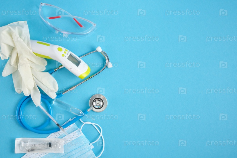 Медицинское оборудование на синем фоне место для копирования вид сверху
