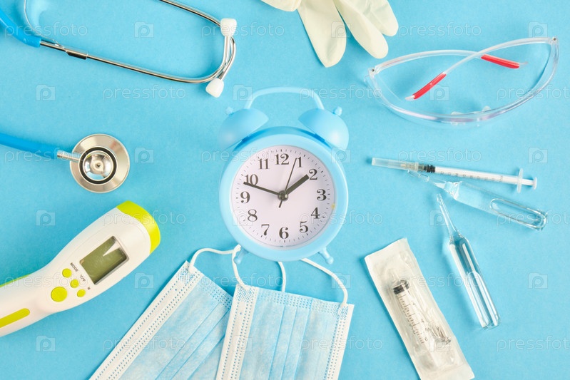 Концепция вакцинации будильник и медицинское оборудование на синем фоне копией пространства