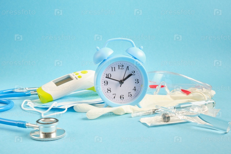 Концепция вакцинации будильник и медицинское оборудование на синем фоне копией пространства