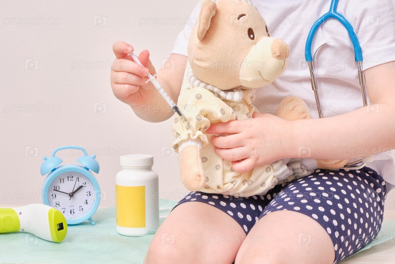 Ребенок делает укол ребенку, делающему укол игрушечному мишке, концепция вакцинации доктор гаметон плюшевому мишке