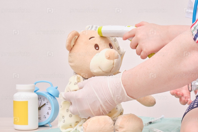 Ребенок стетоскопом измеряет температуру плюшевого мишки инфракрасным бесконтактным термометром