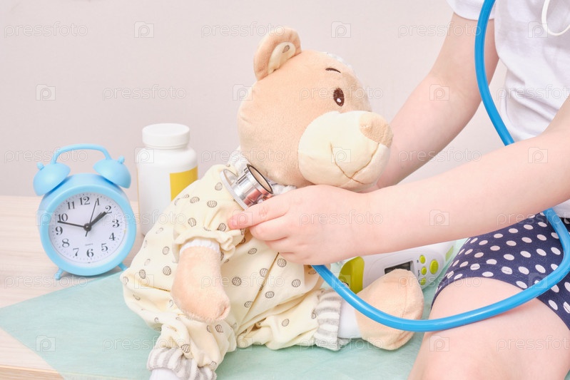 Маленькая девочка играет в доктора и слушает плюшевого мишку со стетоскопом