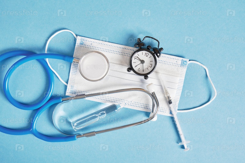 Медицинская концепция "Время здоровья". Будильник маска для лица ампульный шприц со стетоскопом на синем фоне