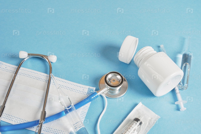 Медицинская концепция "Время здоровья". таблетки маска для лица ампульный шприц со стетоскопом на синем фоне копией пространства