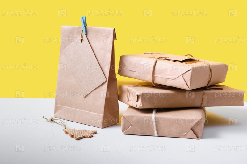 Подарки упакованы в эко бумагу на желтом фоне упаковка для подарков своими руками