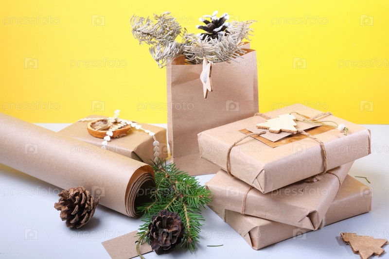 Несколько подарочных коробок, упакованных в эко-бумагу, натуральные украшения для подарков своими руками, еловые ветки, шишки и деревянные фигурки для декора, вид сверху, серый фон, образ жизни без отходов