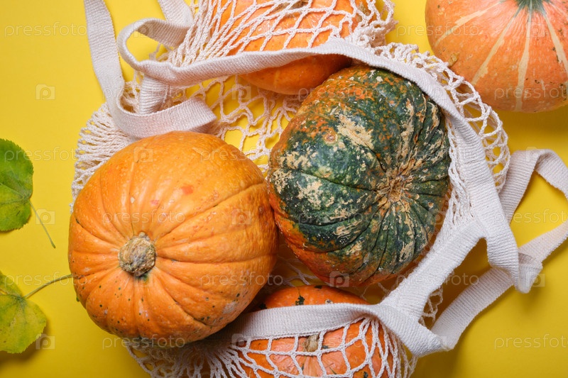 Свежие тыквы, кабачки в экологически чистой сетчатой сумке для покупок, осенние листья на желтом фоне. Концепция Органический урожай овощей. Вид сверху Плоский шаблон
