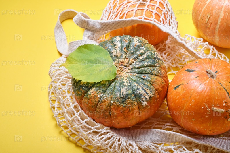 Свежие тыквы, кабачки в экологически чистой сетчатой сумке для покупок, осенние листья на желтом фоне. Концепция Органический урожай овощей. Вид сверху Плоский шаблон