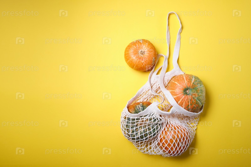 Свежие тыквы, кабачки в экологически чистой сетчатой сумке для покупок, осенние листья на желтом фоне. Концепция Органический урожай овощей. Вид сверху Плоский шаблон