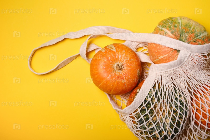 Свежие тыквы, кабачки в экологически чистой сетчатой сумке для покупок, осенние листья на желтом фоне. Концепция Органический урожай овощей. Вид сверху Плоский шаблон