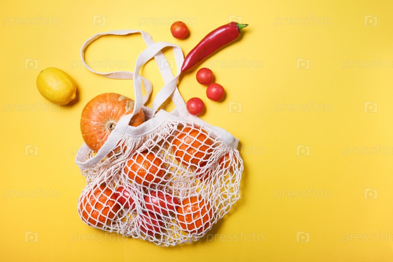 Сочные и свежие овощи и фрукты в многоразовой авоське из экологически чистого хлопка, альтернатива полиэтиленовым пакетам, на белом фоне