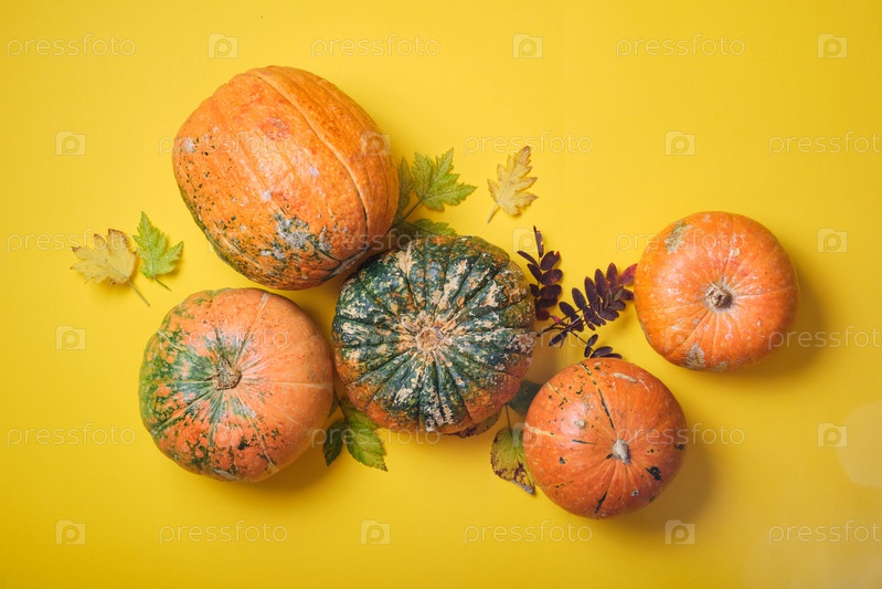 Несколько разных тыкв на осенних желтых листьях, вид сверху на желтом фоне