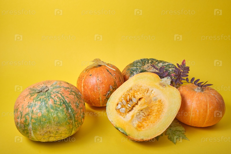 Свежая тыква на желтом фоне, разрезанная пополам тыква и несколько необычных тыкв на желтых осенних листьях