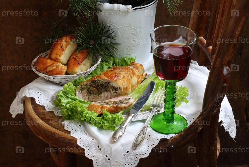 Куриный рулет с грибами на листьях салата и красном вине