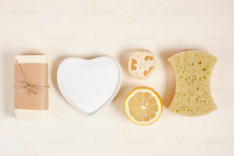 Лимон, губка, люффа, мыло и пищевая сода для домашнего хозяйства