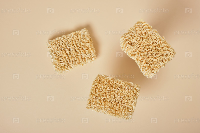 Сушеная лапша быстрого приготовления на бежевом фоне. вид сверху