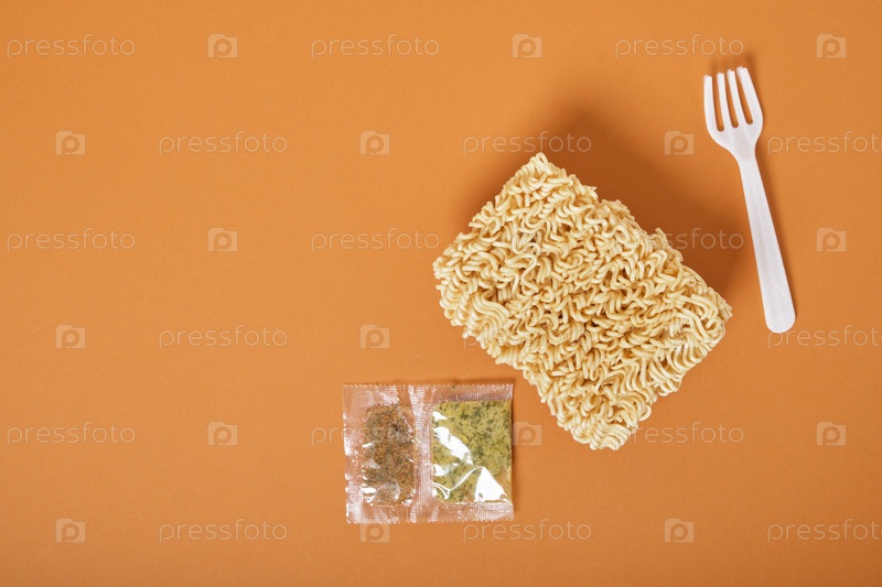 Белая одноразовая пластиковая вилка, три блока сухой лапши быстрого приготовления и специи на коричневом фоне
