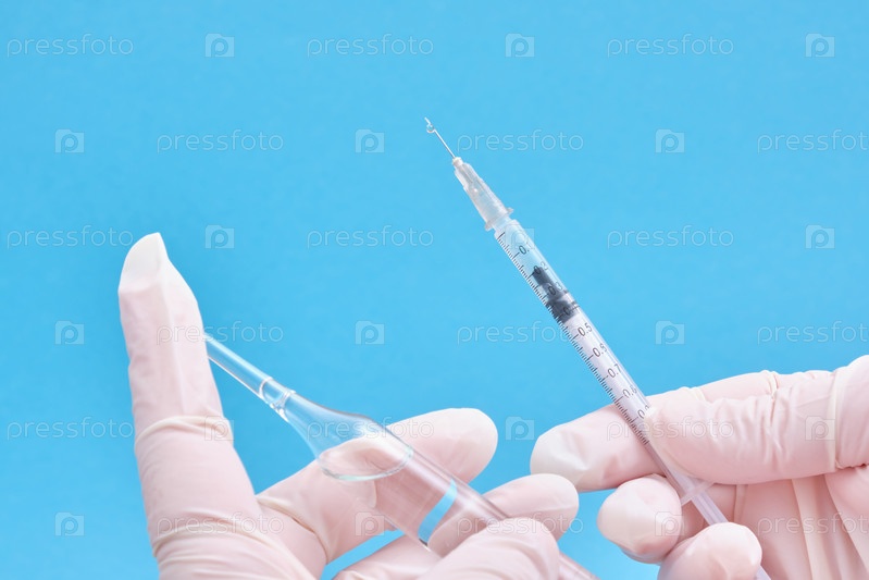 Ампула с лекарством или вакциной и шприц в руках в резиновых перчатках на синем фоне