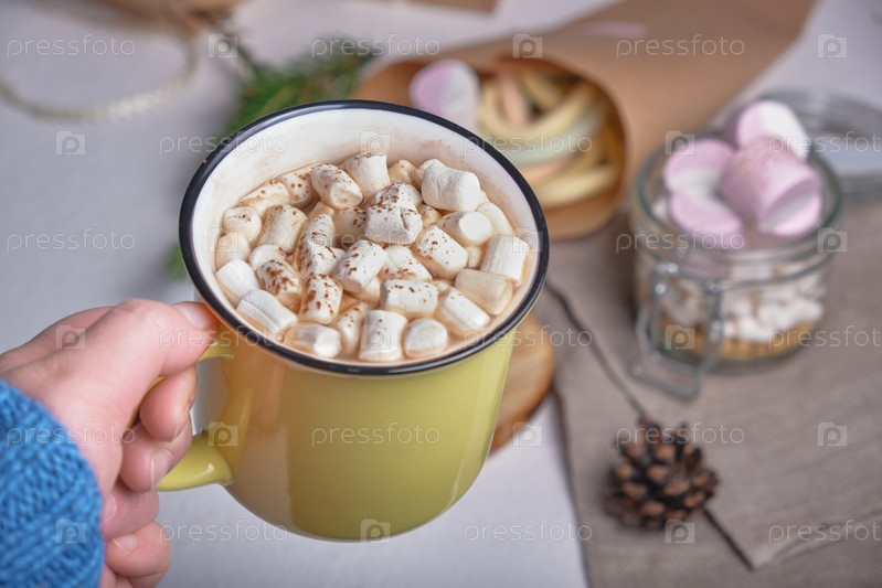 Рука в свитере держит желтую чашку с какао, украшенную зефиром, подставка из спила дерева и зефир на заднем плане