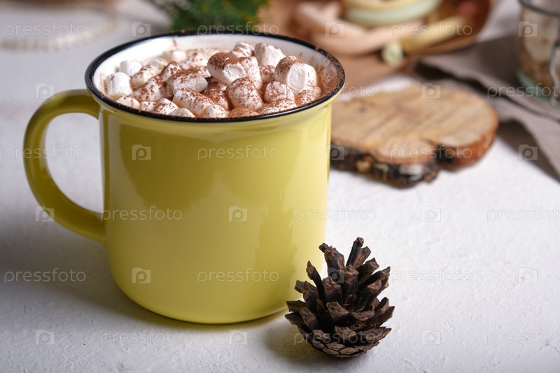 Желтая чашка с какао, украшенная зефиром крупным планом, зефир на заднем плане