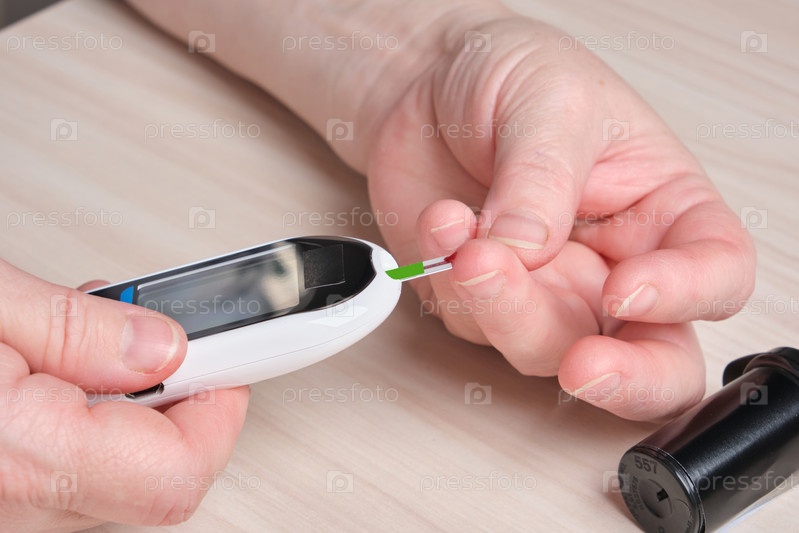 Пожилая женщина с диабетом проверяет уровень сахара в крови с помощью глюкометра, капля крови на пальце, высокий уровень сахара на экране цифрового глюкометра