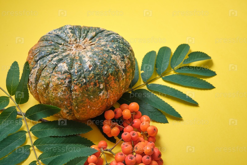 Ветвь рябины с зелеными листьями и зеленой уродливой тыквой на желтом фоне