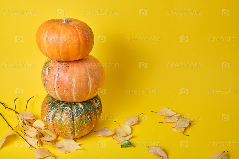 Тыквы стоят друг над другом на желтом фоне