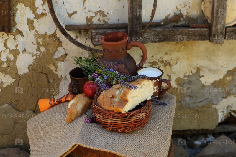 Натюрморт с домашним хлебом и молоком