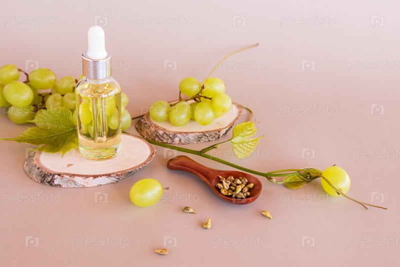 Косметический натуральный продукт на основе масла виноградных косточек в стеклянной бутылке с пипеткой на фоне спелого винограда