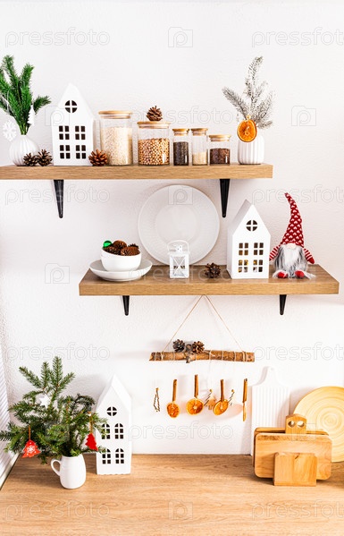 Вид спереди на деревянную столешницу и полки в интерьере современной кухни с посудой и рождественскими украшениями. экологически чистая кухня
