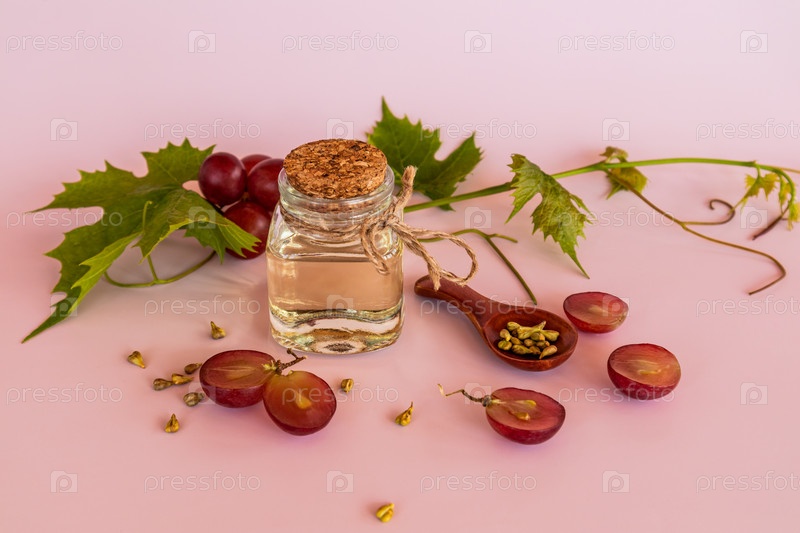 Стеклянная бутылка с пробкой с органическим маслом из виноградных косточек на розовом фоне и виноградной лозе. высокое содержание витаминов, минералов, белка