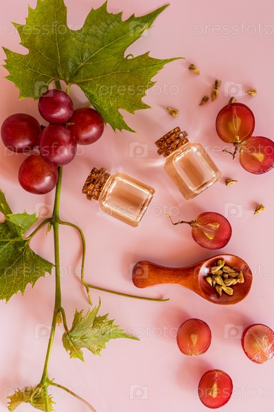 Вид сверху на две стеклянные бутылки с органическим натуральным средством из виноградных косточек. высокое содержание витаминов, минералов, белка