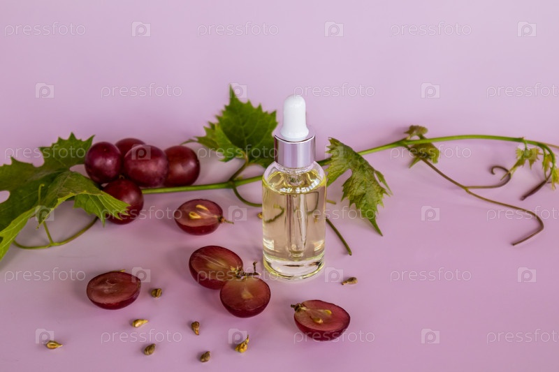 Вид спереди на стеклянную бутылку с косметическим органическим средством по уходу за кожей лица на основе виноградных косточек. эликсир молодости
