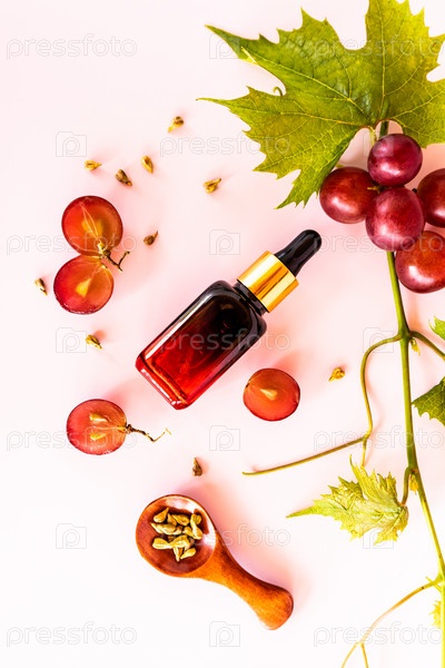 Вертикальный вид косметического флакона с капельницей из цветного стекла с сывороткой для ухода за кожей лица на основе виноградных косточек