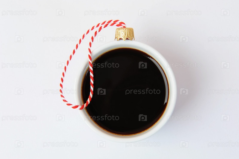 Белая чашка черного кофе эспрессо, украшенная в виде рождественского бала. Крупным планом, белый фон. Концепция новогоднего праздника