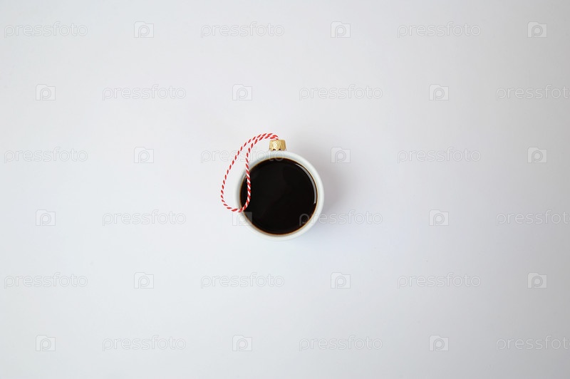 Белая чашка черного кофе эспрессо, украшенная в виде рождественского бала. Крупным планом, белый фон. Концепция новогоднего праздника
