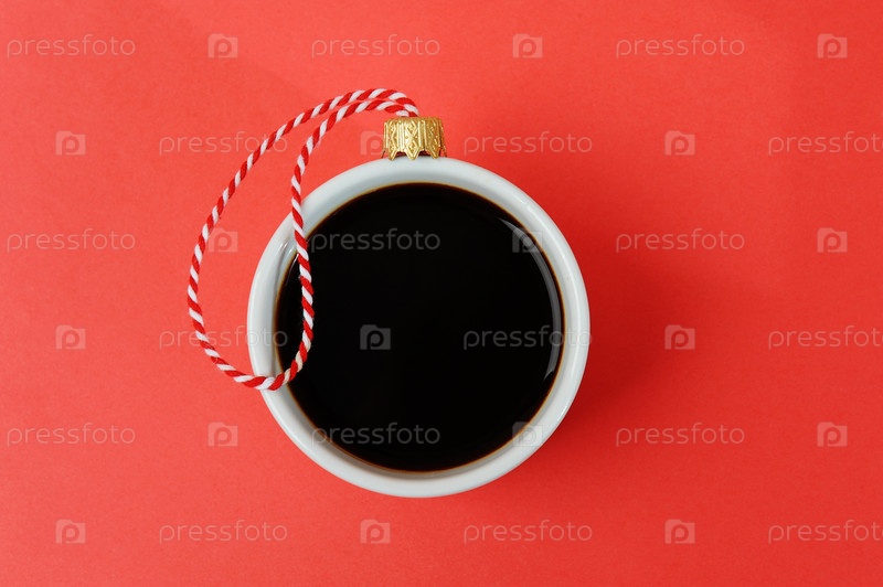 Белая чашка черного кофе эспрессо, украшенная в виде рождественского бала. Крупным планом, красный фон. Концепция новогоднего праздника