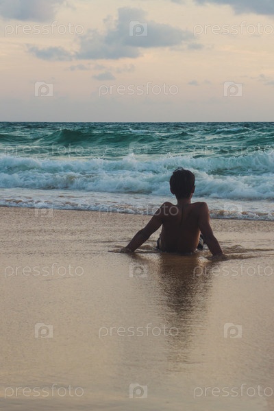 Мальчик сидит на берегу Индийского океана