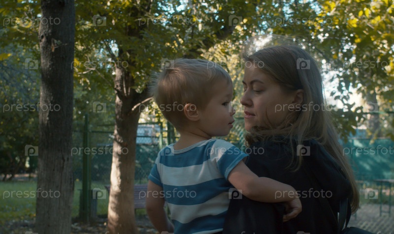 Милый ребенок сидит на руках матери. Мама с сыном на прогулке. Концепция отцовства