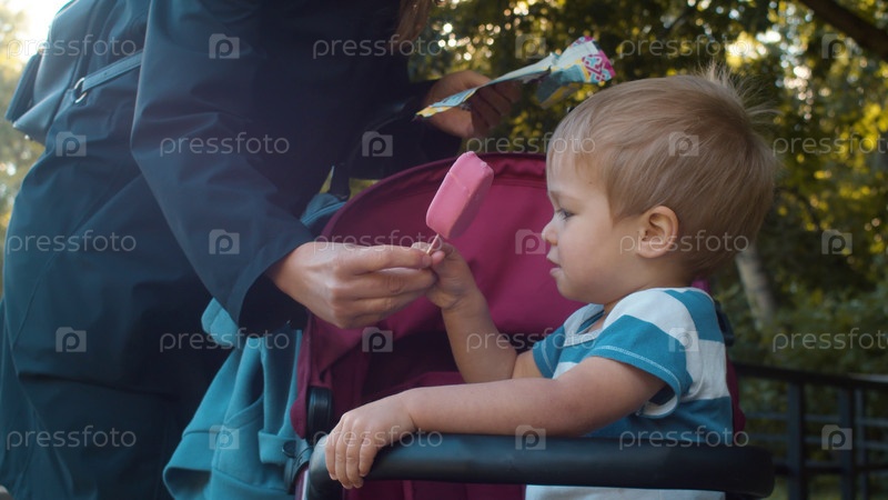 Мама дает мороженое своему сыну. Забавный ребенок сидит в коляске. Солнце светит сквозь листья