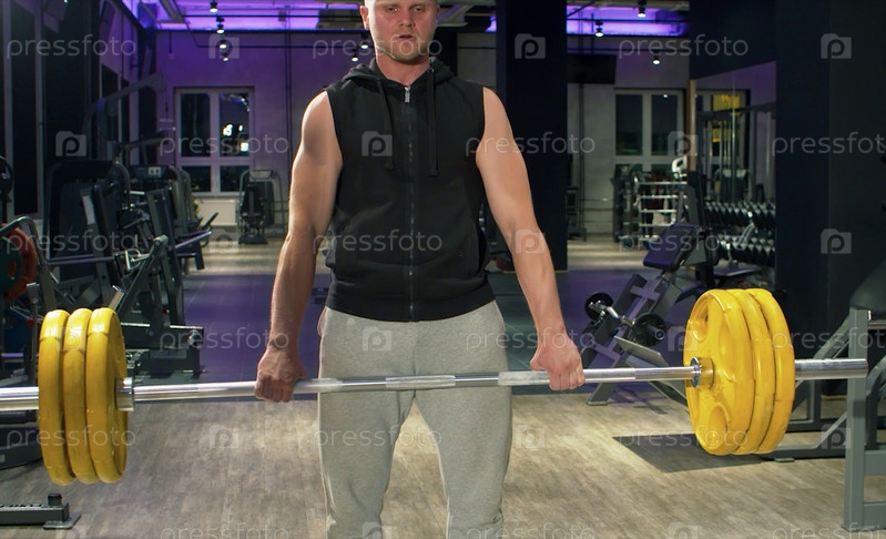 Спортсмен поднимает большую штангу. Тренировка бодибилдера в тренажерном зале