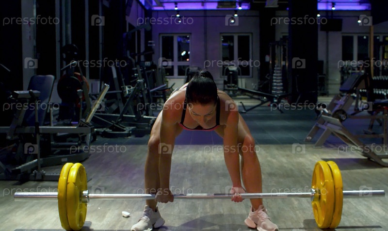 Женщина-бодибилдер поднимает штангу. Спортсмен в тренажерном зале. Концепция фитнеса, спорта и тренировок