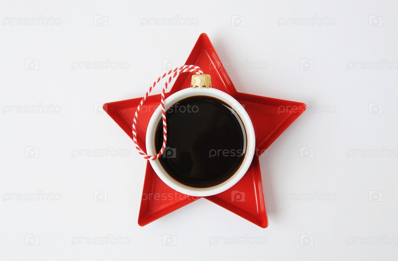 Концепция кофе Рождество Новый год. Чашка черного кофе эспрессо, украшенная елочным шаром на подносе с красной звездой. белый фон