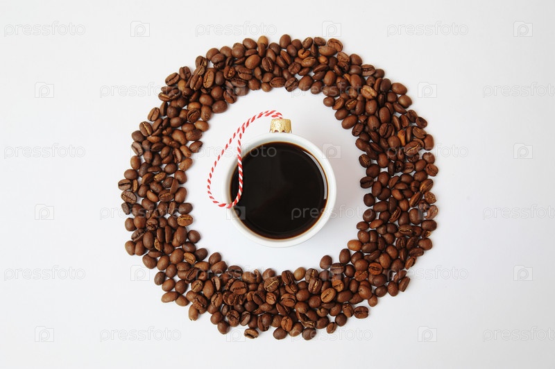 Концепция кофе Рождество Новый год. Чашка черного кофе эспрессо, украшенная елочным шаром. В круглой рамке из кофейных зерен. На белом фоне