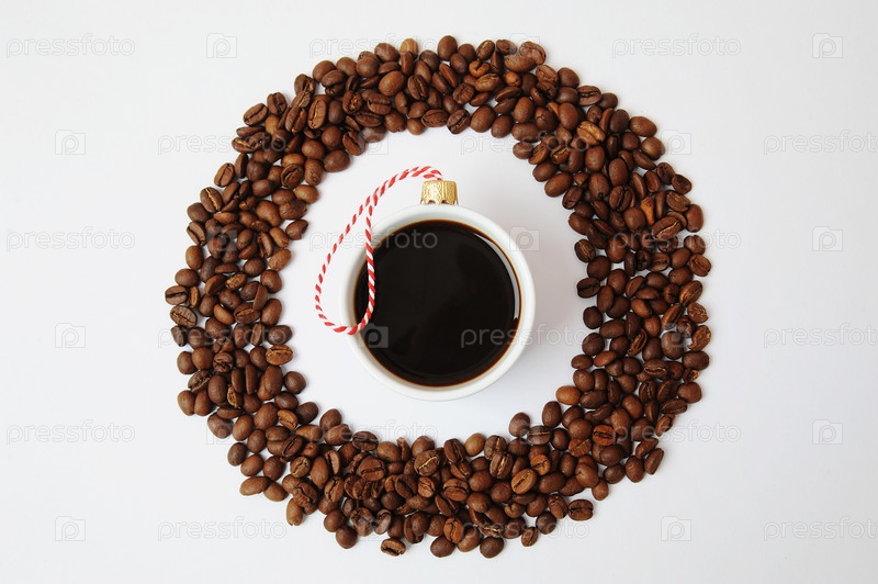 Концепция кофе Рождество Новый год. Чашка черного кофе эспрессо, украшенная елочным шаром. В круглой рамке из кофейных зерен. На белом фоне