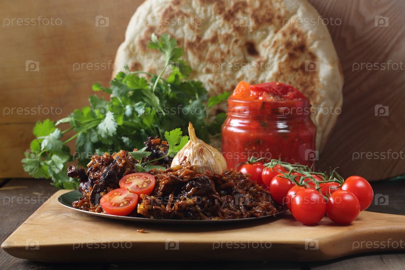 Узбекский плов на деревянном фоне